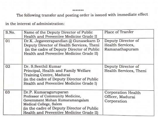 The Directorate of Public Health and Preventive Medicine of Government of Tamil Nadu had issued the order on 28th June 2020, and ti is with immediate effect. Till now, Dr.S.Senthilkumar, Principal, Health and Family Welfare Training Centre in Madurai, was holding additional charge as Madurai Corporation Health Officer.