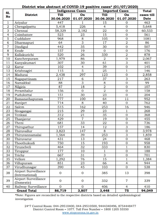 MADURAI: Corona cases continued to spike in Tamil Nadu on 1st July 2020 also as the State had a total of 3,882 new COVID-19 cases today. The total number of Corona confirmed cases in Tamil Nadu till date is 94,049, according to media bulletin released by the Health and Family Welfare Department, Government of Tamil Nadu, today evening at 6 pm- on 1st July 2020.