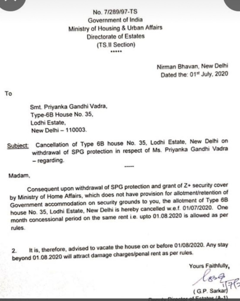 She has been asked to vacate the 6B house No.35, Lodhi Estate, New Delhi, since SPG protection was withdrawn to her. Mrs.Priyanka Gandhi was advised to vacate the house before 1st August 2020 by the Directorate of Estates, Union Ministry of Housing and Urban Affairs, Government of India.