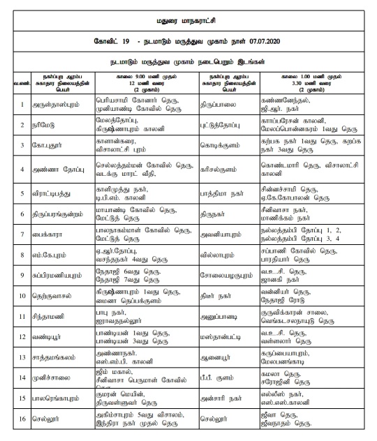 MADURAI: The list of places where mobile medical camps will be conducted in Madurai city on 7th July 2020 was released by the Madurai Corporation today with schedule and timings. Mobile medical camps are being conducted to increase fever surveillance and as part of Corona preventive measures.