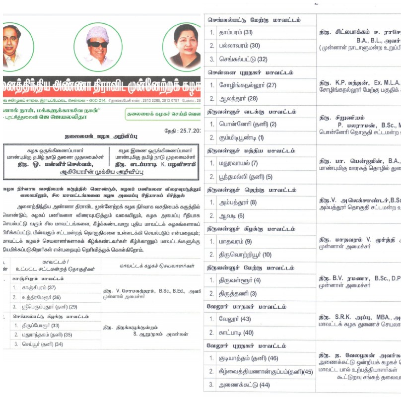 MADURAI: A list of new office-bearers and party’s new district secretaries was released by the AIADMK today- on 25th July 2020- through a media release for the ease of party work and expanding the party activities across Tamil Nadu. In some places, the district units were bifurcated and new office-bearers appointed.