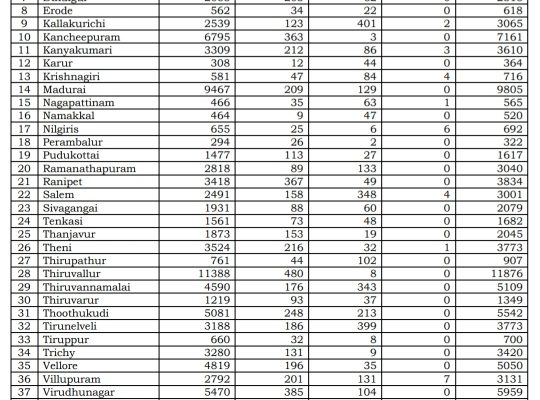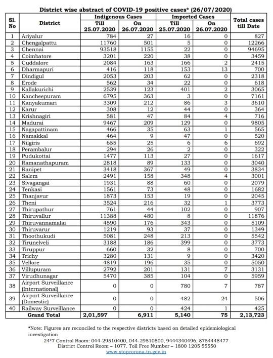 MADURAI: It is 7,000 Corona positive cases in Tamil Nadu in a single day today. On 26th July 2020, Tamil Nadu has reported 6,986 COVID-19 positive cases and the total number of Corona positive cases till date in Tamil Nadu is 2,13,723, according to media bulletin released by Health and Family Welfare Department of Government of Tamil Nadu today evening giving a district wise abstract of COVID-19 positive cases in the State as on 26th July 2020.