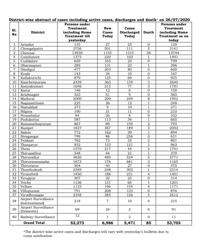 MADURAI: The number of Corona active cases is Tamil Nadu as on Today on 26th July 2020 is 53,703. While 6,986 persons had tested COVID-19 positive in a single day today, there were 5,471 Corona patients who got discharged following treatment today, according to media bulletin released by Health and Family Welfare Department of Government of Tamil Nadu today evening on 26th July 2020. The State had 85 deaths because of Corona virus infection.