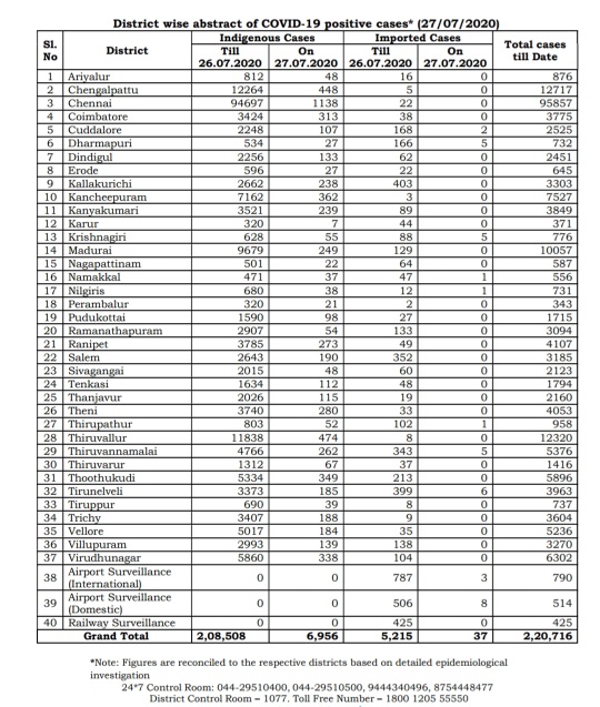 MADURAI: Tamil Nadu is again close to the 7,000-mark in Corona positive new cases reported today- on 27th July 2020. The State had 6,993 COVID-19 positive cases today while the total number of Corona cases till date in Tamil Nadu is 2,20,716, according to media bulletin released by Health and Family Welfare Department of Government of Tamil Nadu today evening – on 27th July 2020.