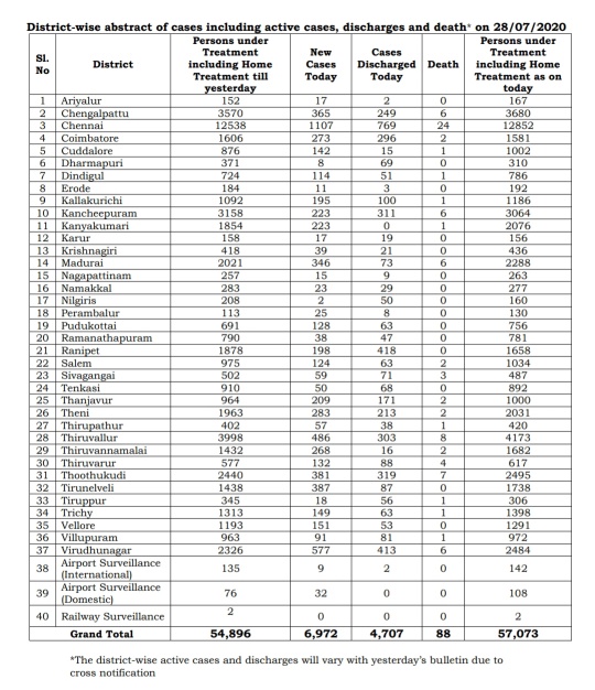 MADURAI: The number of Corona active cases in Tamil Nadu as on today – 28th July 2020 – is 57,073. While 6,972 persons has tested COVID-19 positive in a single day today, there were 4,707 Corona patients who got discharged following treatment, according to media bulletin released by the Health and Family Welfare Department of Government of Tamil Nadu today evening- on 28th July 2020.