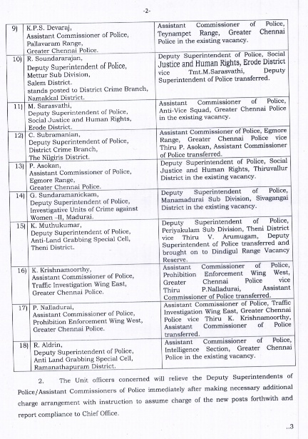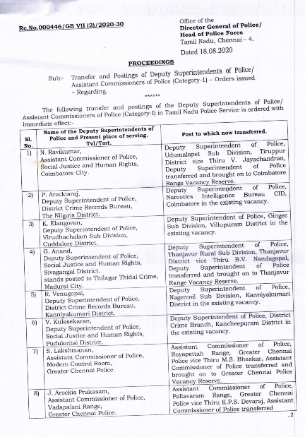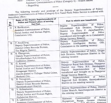 MADURAI: Eighteen DSPs and Assistant Commissioners of Police in Tamil Nadu were transferred and new postings given as per communication received from the office of the DGP of Tamil Nadu on 18th August 2020.