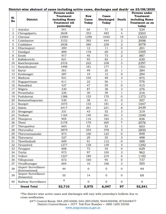 MADURAI: In Tamil Nadu 5,975 persons tested COVID positive on 23rd August 2020. There were 97 deaths because of Coronavirus and totally 53,541 persons are under Corona treatment including home treatment in the State, according to media bulletin released by Health and Family Welfare Department of Government of Tamil Nadu today evening- 23rd August 2020.