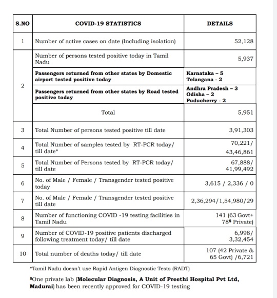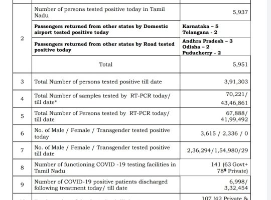 MADURAI: The total number of persons tested COVID-19 positive in Tamil Nadu till date is 3,91,303. A media bulletin on Corona positive statistics was released by the Health and Family Welfare Department of Government of Tamil Nadu today evening- on 25th August 2020.