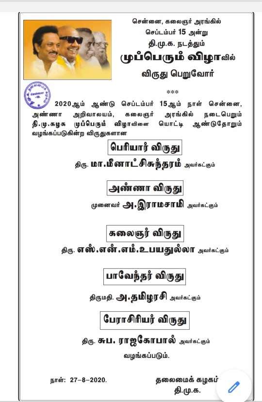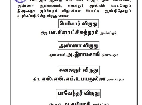 MADURAI: The DMK has today announced awards to be presented to four eminent persons on 15th September 2020. A press release from the DMK headquarters has informed on 27th August that it will be a ‘Mupperumvizha’ to honour, to present awards and felicitate the award recipients.