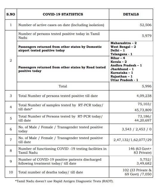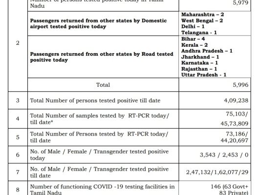 MADURAI: The Health and Family Welfare Department has released the media bulletin today evening giving total statistics of Corona cases and COVID-19 position in the State as on 28th August 2020. Total number of persons tested Corona positive in Tamil Nadu as on today is 4,09,238, the media bulletin on 28th August 2020 informed.