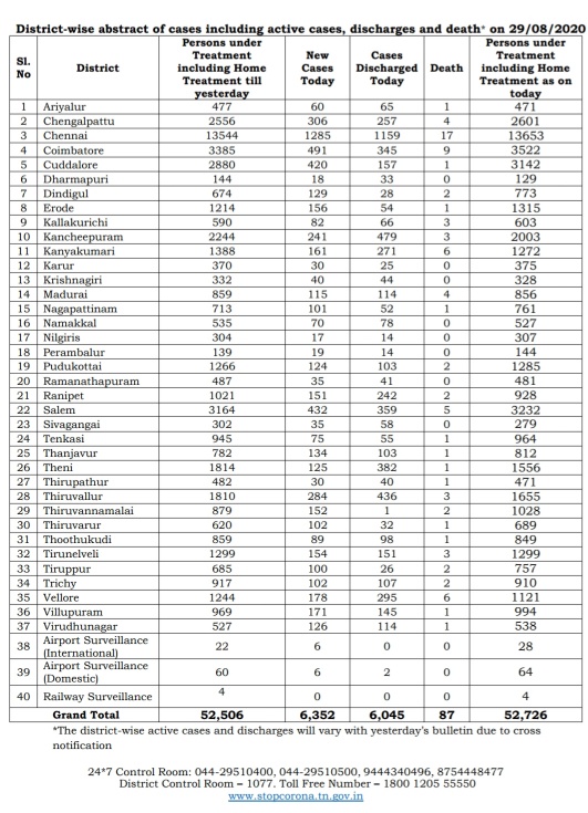 MADURAI: After some break, again there were more than 6,000 new Corona cases in Tamil Nadu on 29th August 2020. According to the media bulletin released today evening, there were 6,352 new COVID-19 cases on 29th August 2020, there were 87 deaths and 52,726 persons under treatment in Tamil Nadu as on today.