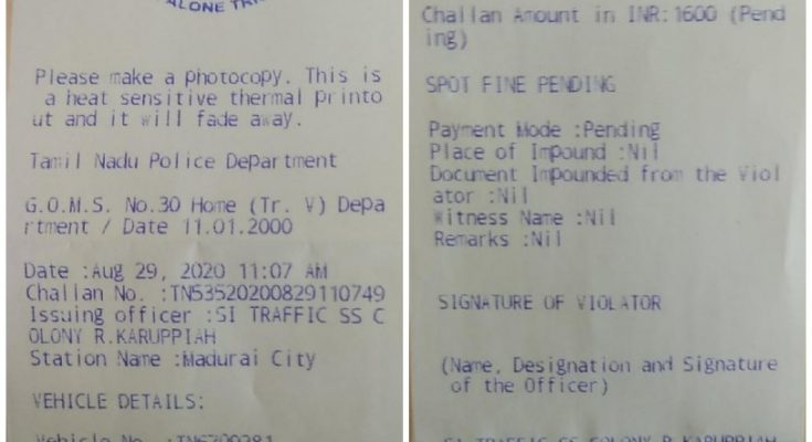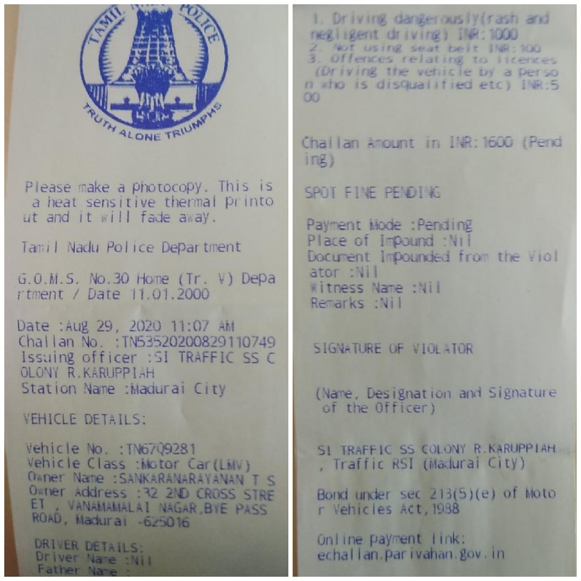 MADURAI: Mr.T.S.Sankara Narayanan, Tamil Nadu State General Secretary of Hindu Maha Sabha, has today asked for the support of Madurai City Police Commissioner requesting him to take steps for withdrawing the fine imposed on him by police while driving his car on ByPass Road in Madurai on 29th August 2020 at 11 am.