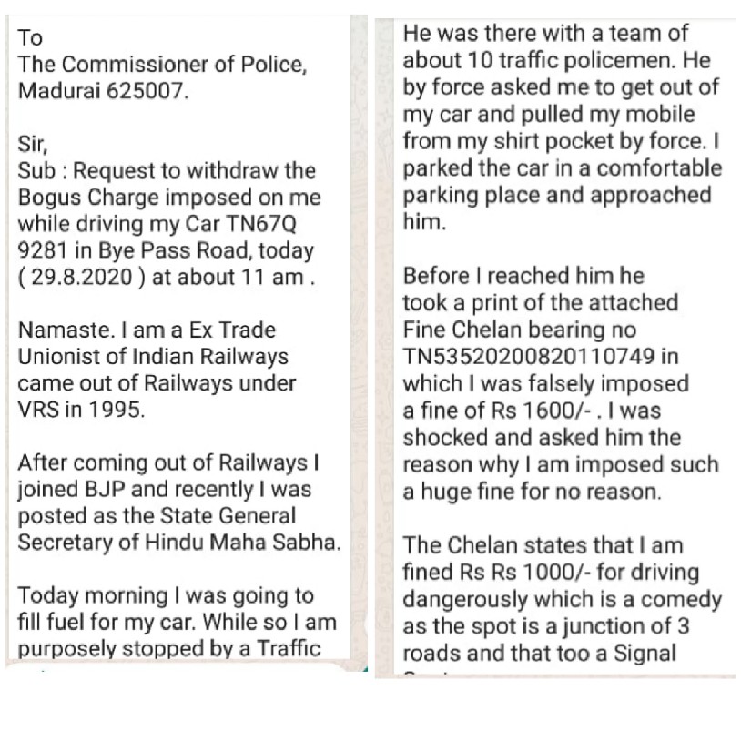 “I have a fear that the police who behaved badly here today will be a threat for my peaceful living. I request you to protect me and my family…… I am a resident of Vanamamalai Nagar—-Bye Pass Road in Madurai.Please take action to withdraw the bogus charge imposed on me today. This incident happened at Ellis Nagar Junction in Madurai today where traffic police collected fine from me despite following traffic rules. I am a law abaiding citizen, I have all valid legal documents for my vehicle, the police behaviour was bad,” Mr.T.S.Sankara Narayanan had complained in his letter to the Madurai City Police Commissioner here on 29th August 2020.
