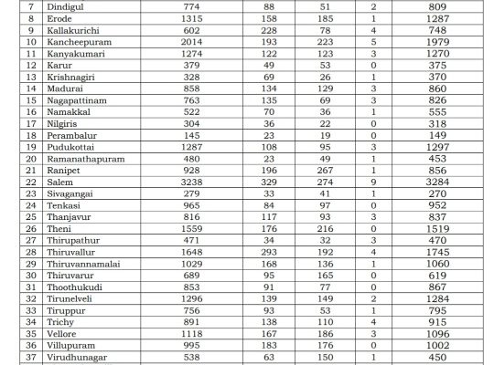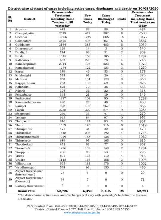 MADURAI: There were 6,495 new cases of Corona positive in Tamil Nadu on 30th August 2020. Totally 94 deaths were reported from various districts in the State today. The total number of persons under COVID-19 treatment in Tamil Nadu as on 30th August 2020 is 52,721. A media bulletin with all details of discharge, new cases and deaths etc was released by the Health and Family Welfare Department of Government of Tamil Nadu today evening at 8 pm.