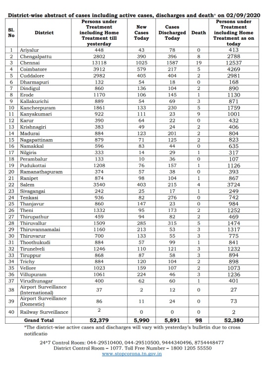 MADURAI: Today, there were 5,990 new Corona cases in Tamil Nadu and 98 deaths, according to the media bulletin issued on 2nd September 2020 by the Health and Family Welfare Department of Government of Tamil Nadu today evening. Totally, 5,891 persons were discharged today after completing COVID treatment.