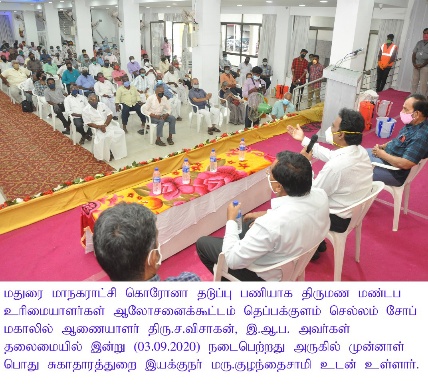 MADURAI: In the wake of several relaxations and ease of Corona lockdown rules from 1st September 2020 in Tamil Nadu, a thorough review meeting was held by the Madurai Corporation in Madurai on 3rd September exclusively for marriage halls.