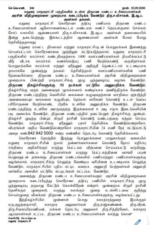 Madurai Corporation Commissioner Mr.S.Visakan has today made it clear that thermal scanner fever screening, six-feet distance in seating, sanitizer, social distancing and all COVID-19 norms are a must to be implemented in all marriage halls. “If there is any need for alert or a clarification, the marriage hall owners can call 84284-25000. It is also important that the marriage halls must pay the dues to the Madurai Corporation immediately. Please take all steps to follow COVID prevention rules,” Corporation Commissioner Mr.S.Visakan has said at the review meeting held Zone-3 Teppakulam- at Selvam Soap Mahal.