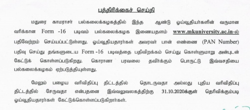 Dr.V.S.Vasantha, MKU Registrar in-charge, has said in a press release here on 3rd September 2020 that Form 16 has been put on varsity website for pensioners’ convenience. The pensioners can inform the MKU Registrar’s office by 31st October.