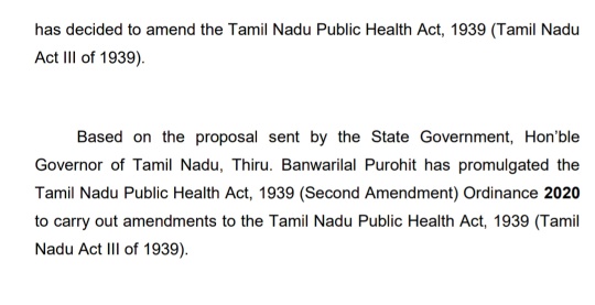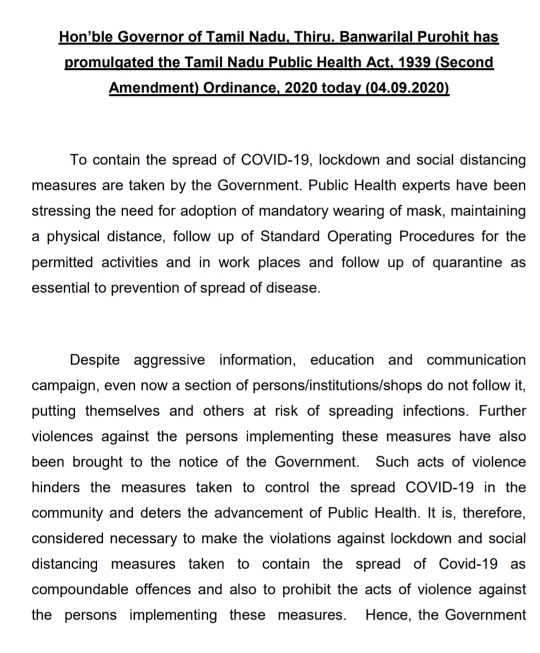 MADURAI: Tamil Nadu Governor Mr.Banwarilal Purohit has promulgated an Ordinance today- on 4th September 2020- amending the Tamil Nadu Public Health Act, 1939 (Second Amendment Ordinance,2020). This is to contain the spread of COVID-19 in Tamil Nadu and various safety measures announced by the State government.