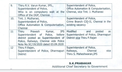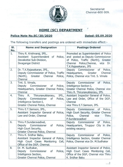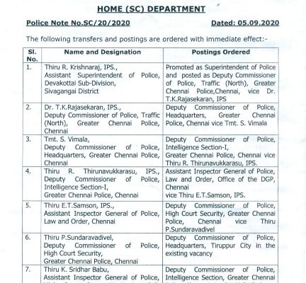 MADURAI: A few senior level police officers in Tamil Nadu have been transferred and new postings given with immediate effect on 5th September 2020.