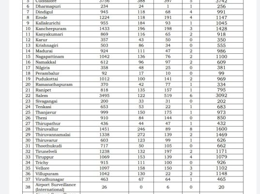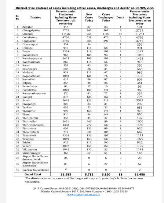 MADURAI: Tamil Nadu had reported 5,783 new Corona positive cases on 6th September 2020. There were 88 deaths in the State today, according to the COVID-19 media bulletin released by the Health and Family Welfare Department of Government of Tamil Nadu today evening.