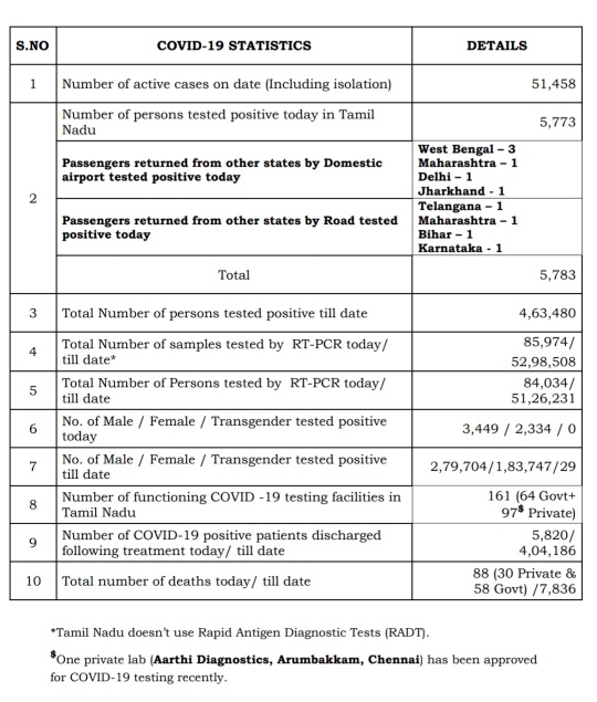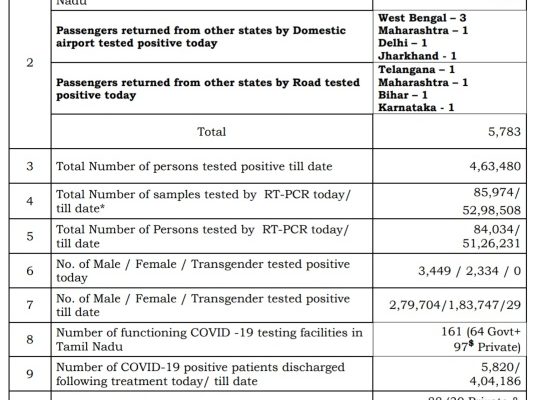MADURAI: The total number of persons who tested Corona positive in Tamil Nadu till date is 4,63,480, according to the media bulletin released by Health and Family Welfare Department of Government of Tamil Nadu on 6th September 2020- today evening.