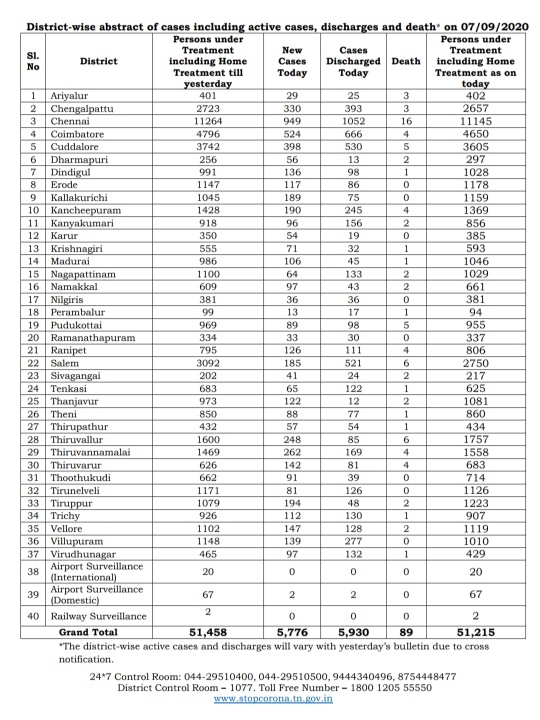 MADURAI: Tamil Nadu today had 5,776 new Corona positive cases and 89 deaths, according to the COVID-19 media bulletin released by the Health and Family Welfare Department of Government of Tamil Nadu today – on 7th September 2020.