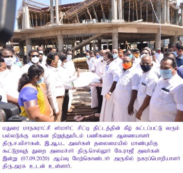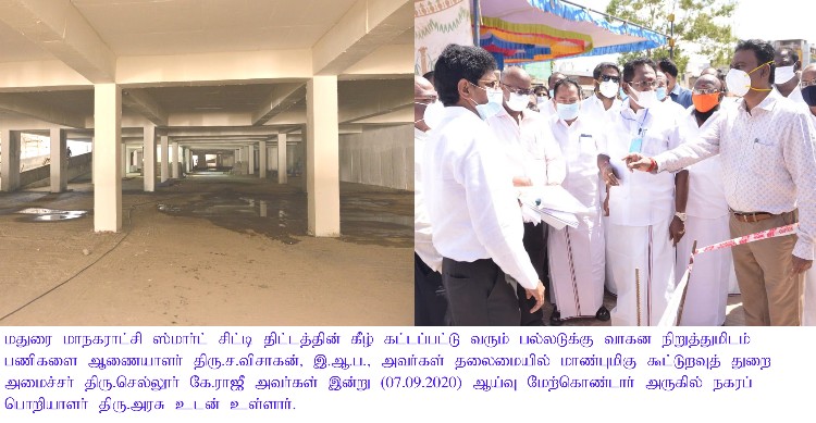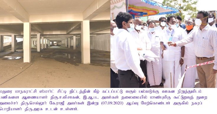 A press release from the Madurai Corporation here on 7th September 2020 has informed that there will be parking facility for 110 four wheelers and 1,401 two-wheelers in this vehicle parking unit coming up under the Smart City project in Madurai city near the Meenakshi temple. City Engineer of Madurai Corporation Mr.Arasu, Executive Engineer Mr.Rajendran and Mr.Murugesa Pandian, Corporation PRO Mr.Chithravel were among those present during the Minister’s visit here today.