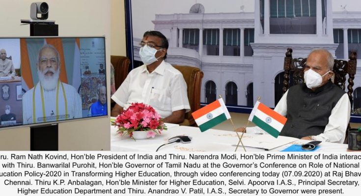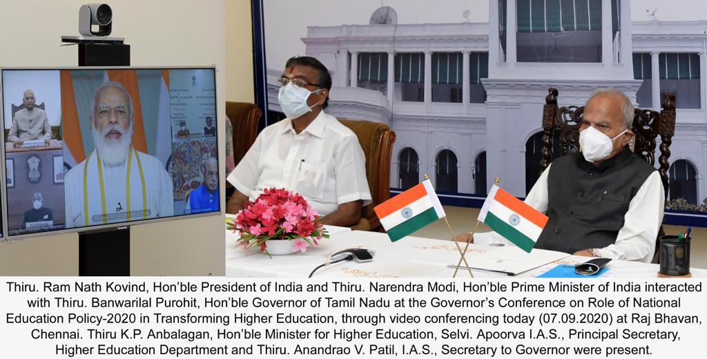 MADURAI: Tamil Nadu Governor Mr.Banwarilal Purohit today took part in the Governors’ Conference on Role of National Education Policy-2020, which was addressed by President Mr.Ram Nath Kovind and Prime Minister Mr.Narendra Modi. This was an interaction meeting addressed on 7th September 2020 by the President and Prime Minister through video-conferencing.