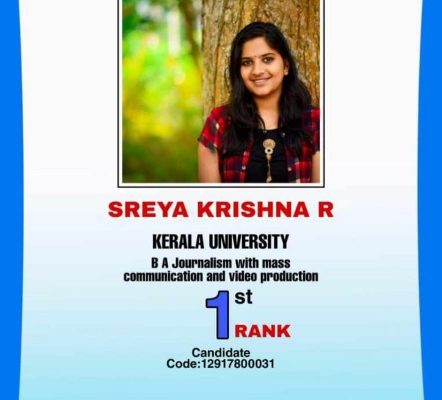 Hailing from Valiyasala locality in Thiruvananthapuram city, Ms.Sreya is set to achieve success as her plans are clear. She is ready to study a PG course for television broadcast journalism with technical capability. This first ranker is waiting to join a reputed university. She is taking up journalism field as a passion, mission and as a challenge because from her childhood she wanted to do something for the people and society through the media field.