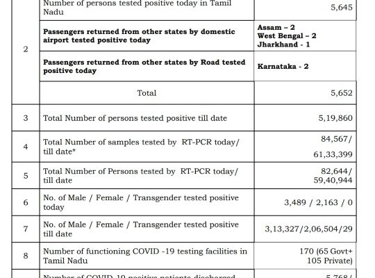 MADURAI: The total number of persons who tested Corona positive in Tamil Nadu till date is 5,19,860, according to the media bulletin released by Health and Family Welfare Department of Government of Tamil Nadu on 16th September 2020- today evening.