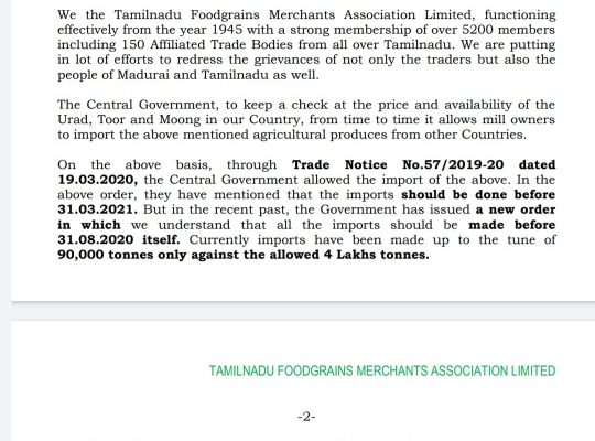 MADURAI: The Tamil Nadu Foodgrains Merchants Association has appealed from Madurai today to the Union Minister for Commerce and Industry Mr.Piyush Goyal and to the Directorate General of Foreign Trade (DGFT) on 16th September 2020, and also to the Tamil Nadu Chief Minister Mr.Edappadi K.Palanisamy to extend the date of imports of the permitted four lakh tonnes of Urad till 31st March 2021. A press release was issued from Madurai today by Mr.S.P.Jeyapragasam, president, Tamil Nadu Foodgrains Merchants Association Limited.