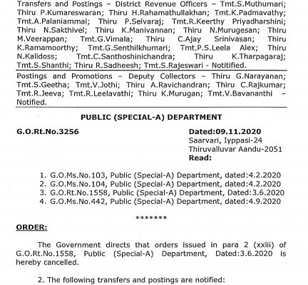 MADURAI: The Tamil Nadu State Government has transferred DROs of various districts/ and senior officials in different department through a special order issued dated 9th November 2020. A press release of this was received today from sources.