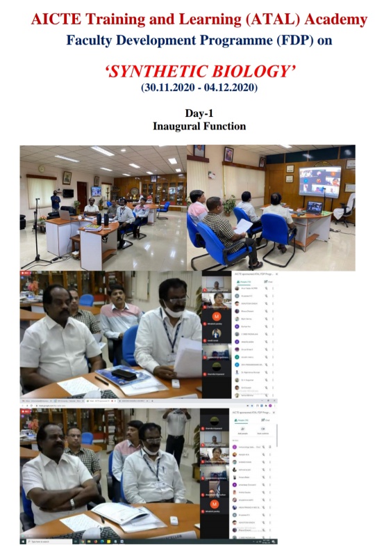 An inaugural function was organized by video conferencing mode on 30th November 2020 in the MKU campus in Madurai, Prof. K. Balakrishnan, Co-ordinator, ATAL-FDP programme had welcomed the participants and experts, MKU Vice-chancellor Prof. M. Krishnan delivered presidential address while Dr. V. S. Vasantha Registrar (in-charge) delivered keynote address and highlighted different research areas in Synthetic Biology. Dr. R. Ranjith Kumar, Deputy coordinator, and others spoke.