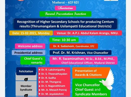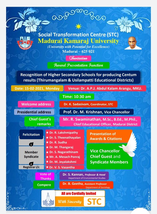 Mr. K.Sadasivam, Coordinator of Social Transformation Centre (STC) in MKU here, has informed to the media on 14th February 2021 that the STC is organizing an award presentation function to give away awards and citations to the higher secondary schools in Thirumangalam and Usilampatti educational districts which produced centum results in higher