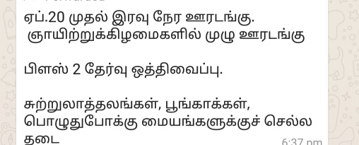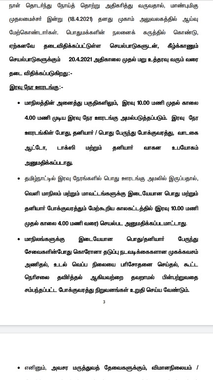 MADURAI: In view of the heavy spread of Corona second wave where COVID-19 virus infection cases is increasing rapidly, the Tamil Nadu State Government has decided to enforce NIGHT TIME LOCKDOWN ACROSS THE State from 20th April 2021 (from 10 pm to 4 am). The scheduled Plus Two examinations of Plus Two public examinations were also postponed by the Tamil Nadu government in an important announcement made today through a public announcement on 18th April 2021. Ban has been imposed on tourist places, parks, entertainment spots etc.