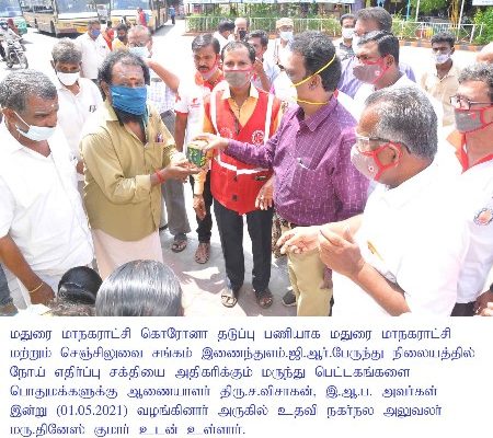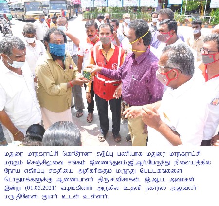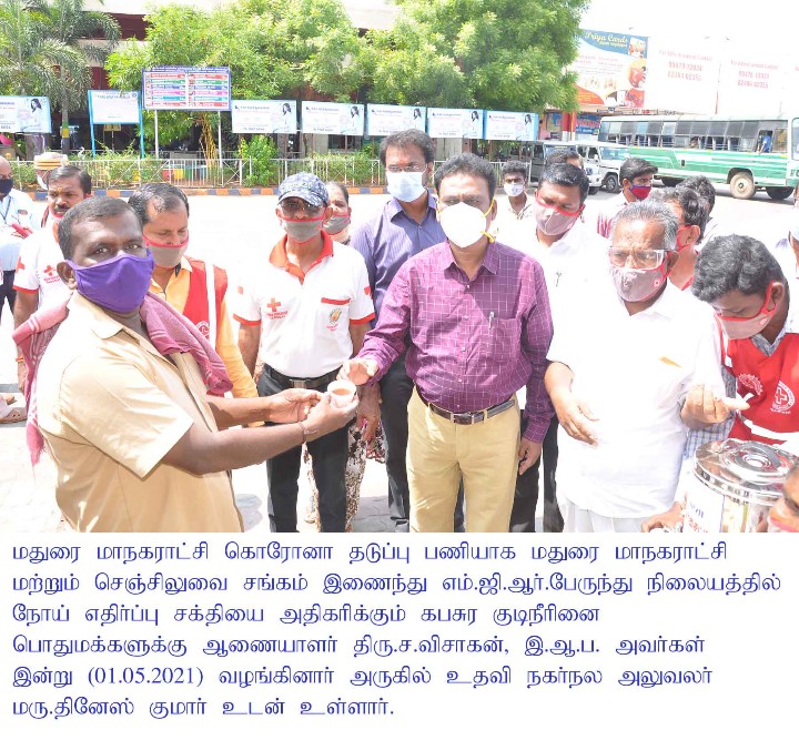 Madurai Corporation Commissioner Mr.S.Visakan and ACHO Dr.Dineshkumar along with Madurai Corporation PRO Mr.Chithravel and corporation health officials, took part in the ‘Kabasura Kudineer’ herbal drink distribution which was organized by the Madurai Corporation in association with Chensiluvai Sangam, at the Mattuthavani Bus Stand in Madurai city on May 1st 2021.