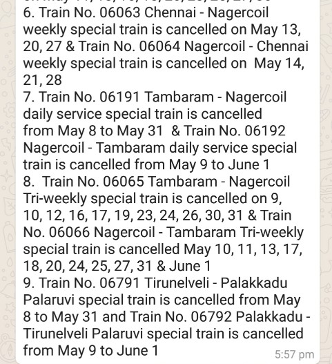 MADURAI: Because of less patronage and demand in view of the prevailing circumstances, many important trains in Tamil Nadu which are running from Madurai Division of the Southern Railway have been cancelled for the month of MAY 2021, according to a press release received from the Madurai Division of Southern Railway here today- on 6th May 2021 (Thursday). The trains cancelled for the month of May 2021 include Vaigai Express, Pallavan Express, TEJAS Express, Chennai Egmore- Nagercoil weekend special train etc.