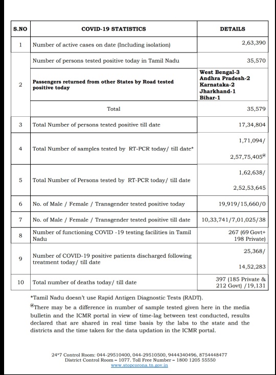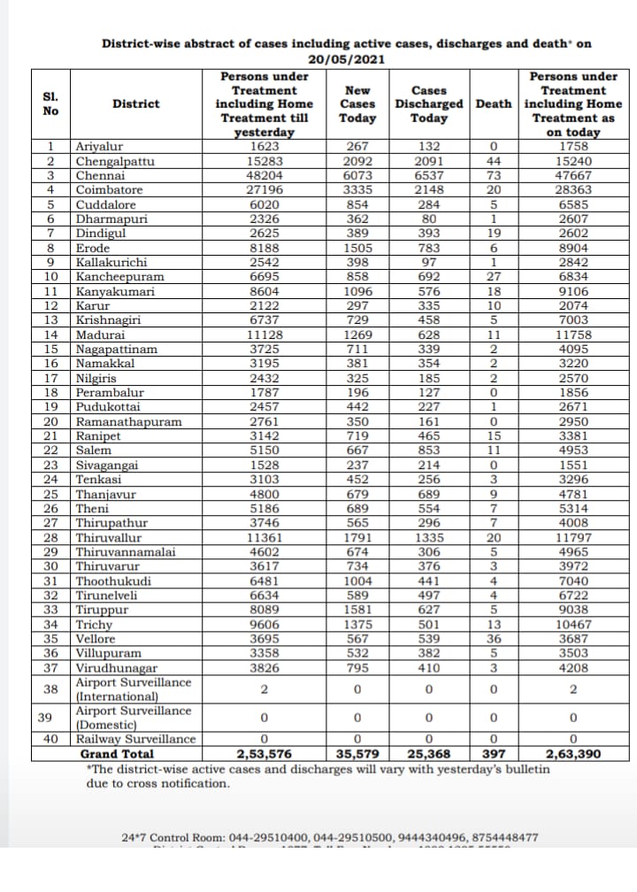 MADURAI: Tamil Nadu had 35,579 new COVID positive cases on 20th May 2021- Thursday. Total number of deaths of Corona patients in the State is 397, according to the media bulletin released by Health and Family Welfare Department of Government of Tamil Nadu today evening- giving full Corona positive updated particulars of all districts in Tamil Nadu for May 20th 2021, at 7 pm.