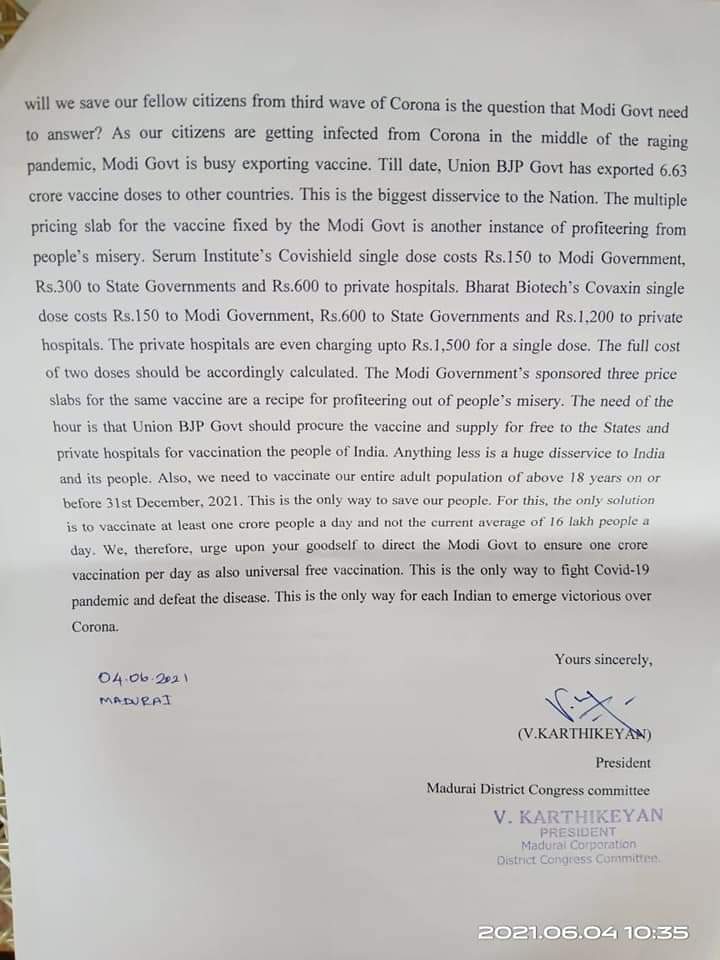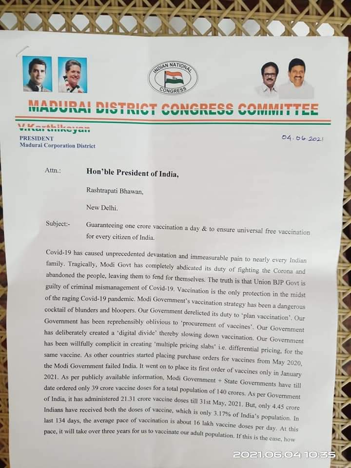 Mr.V.Karthikeyan, president, Madurai City district unit of Congress party, has sent a representation to the President on 4th June 2021 in this regard. He had explained about the hardships faced by the people in getting Corona vaccination now.