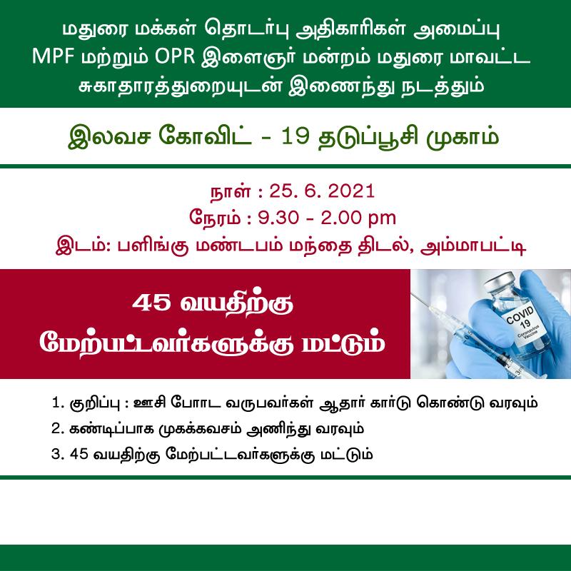 This Corona virus vaccination camp was conducted by MPF in coordination with the local youth wing team and with the support of Ammapatti villagers, Tirumangalam taluk office staff and other well-wishers. Totally, 101 persons were administered COVID vaccine in the special camp held on 25th June 2021, Mr.SG.Ramanathan, secretary, Madurai Public Relation Officers Federation (MPF), informed today. Mr.SG.Ramanathan has thanked all the medical staff, doctors, nurses and others who supported for holding the Corona vaccination camp at Ammapatti near Tirumangalam in Madurai district today.