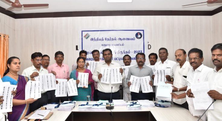 MADURAI: As per the electoral draft roll publication released by the Tamil Nadu State election authorities on November 9th 2022, there are totally 26,35,238 voters in Madurai district. The VOTERS DRAFT ROLL constituency wise in Madurai district of the electors was released in Madurai by District Collector Dr.S.Aneesh Sekhar today in the presence of senior district officials after which he had flagged off the the voter awareness campaign programme that started from the Madurai District Collectorate here. There are 12,96,075 male voters in Madurai district, and 13,38, 950 female voters in Madurai district and 213 transgender voters in Madurai district. “The number of electors / voters in Madurai district as on 9th November 2022 is totally 26.35,238,” a press release received from the Madurai District Collectorrate here today has informed.
