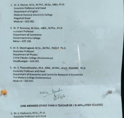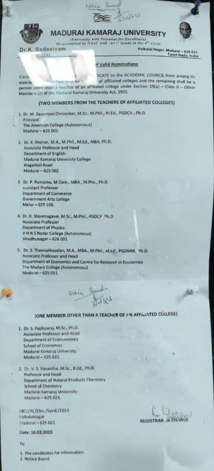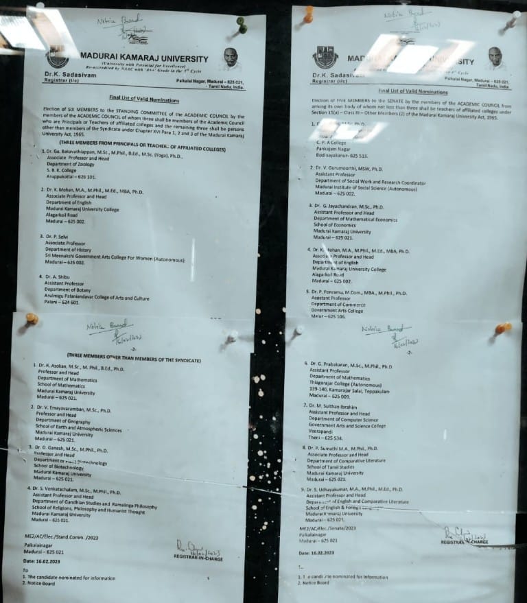 MADURAI: The final list of candidates who are in the fray for election to become Syndicate members from the Academic Council, and to the Senate and Academic Council of Madurai Kamaraj University (MKU) was announced after a full scrutiny of nominations on 16th March 2023. The Registrar in-charge of MKU has officially given the names of candidates of valid nominations today evening. The list of candidates who are in the fray for Syndicate, Academic Council and Senate are: