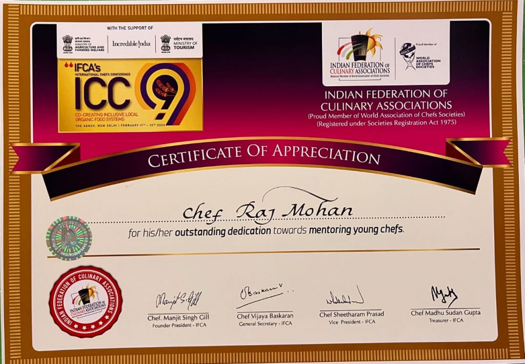 “This award was presented to chef M.S.Rajmohan for his dedication and hard work as culinary educator and in culinary field academics, for being a source of inspiration for young chefs. He has been carrying foward the IFCA mission and the World Association of Chefs’ Societies (WACS) ceaselessly for a decade,” a press release received here on February 15th 2023 has informed.