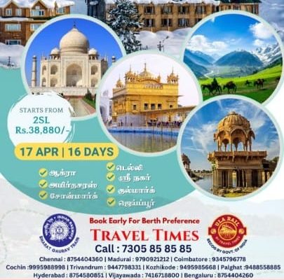 The first train will start from Madurai on April 17th 2023 for a 16-day tour with a 3-AC package cost of Rs.51,900 and 2SL Rs.38,880. Another train will start from Coimbatore on May 7th 2023 and the package rate in this train for 15 days is FIRST AC Rs.73,000 and 3rd AC Rs.47,700. (www.railtourism.com and for advanced bookings contact 73058- 58585).