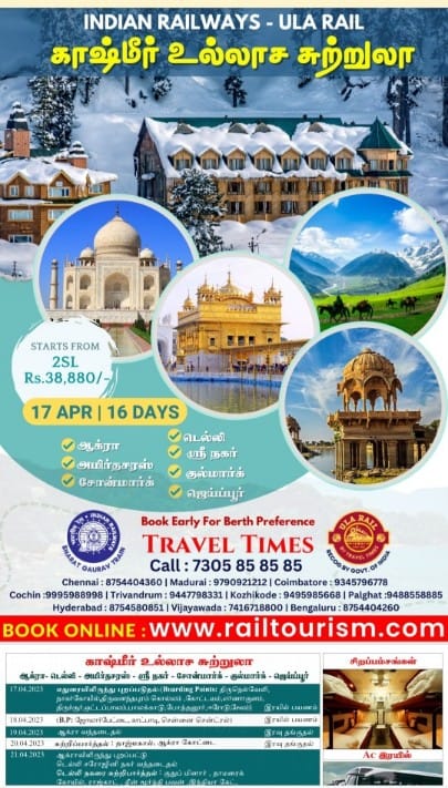 MADURAI: The Indian Railways-Ula Rail is running a special tourism train from Madurai to Kashmir in the month of April 2023 through its ‘Bharat Gaurav’ package summer tour special of IRCTC. This Kashmir special tour package is in association with ‘Travel Times’ that is all set to take the travel, tourism and pilgrim passengers in a special summer jolly recreation package tour through the railway’s association with a private sector player.