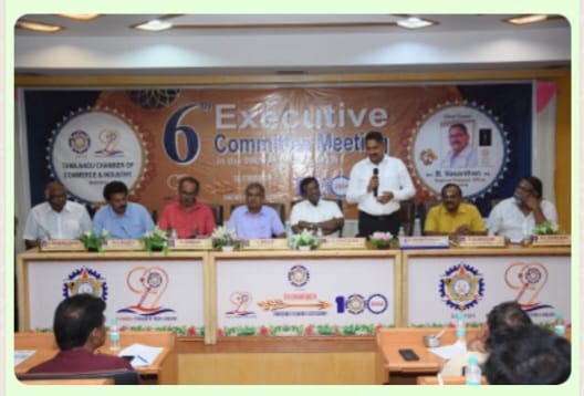 This is the 99th year of Tamil Nadu Chamber of Commerce and Industry and the sixth EC meeting in this 99th year took place on 28th March 2023 in Madurai. Chamber president Dr.N.Jegatheesan had presided over the meeting and was attended by co-office bearers of the chamber including vice-presidents D.S.Jeeier Babu, and G.Elangovan, TN Chamber secretary J.Selvam, treasurer S.Sridhar, joint secretaries M.A.Rajeev, A.Sundaralingam and others.