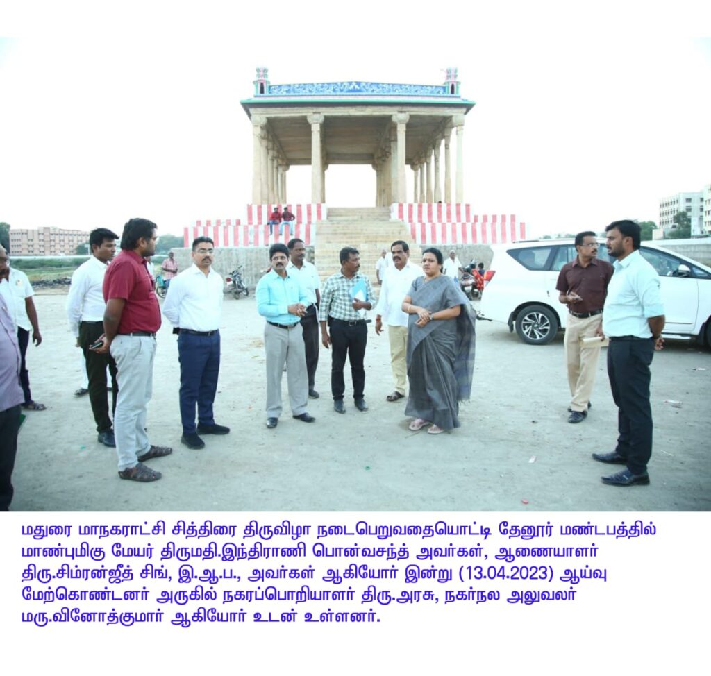 The Mayor and Corporation commissioner went to Thenur Mandapam and Vandiyur Perumalkoil Mandapam and enquired about the arrangements being made for Chithirai festival. They also went to Alwarpuram area in the city where the famous entry of Lord Kallazhagar into Vaigai river will take place in the presence of thousands of devotees.