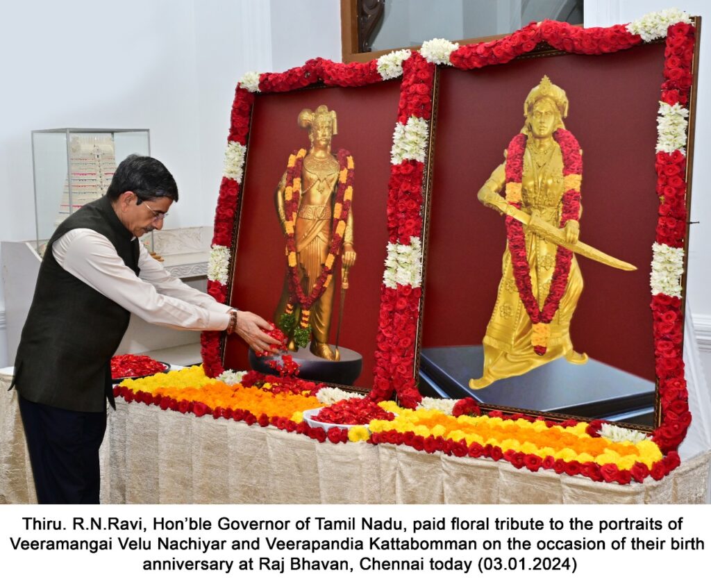 CHENNAI: Tamil Nadu Governor Mr.R.N.Ravi and his wife Laxmi Ravi had paid floral tributes to freedom fighters Veerapandiya Kattabomman and Veeramangai Velu Nachiyar at Raj Bhavan in Chennai today- on January 3rd 2024 – on their birth anniversary.