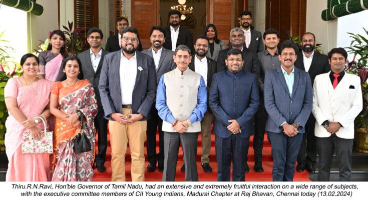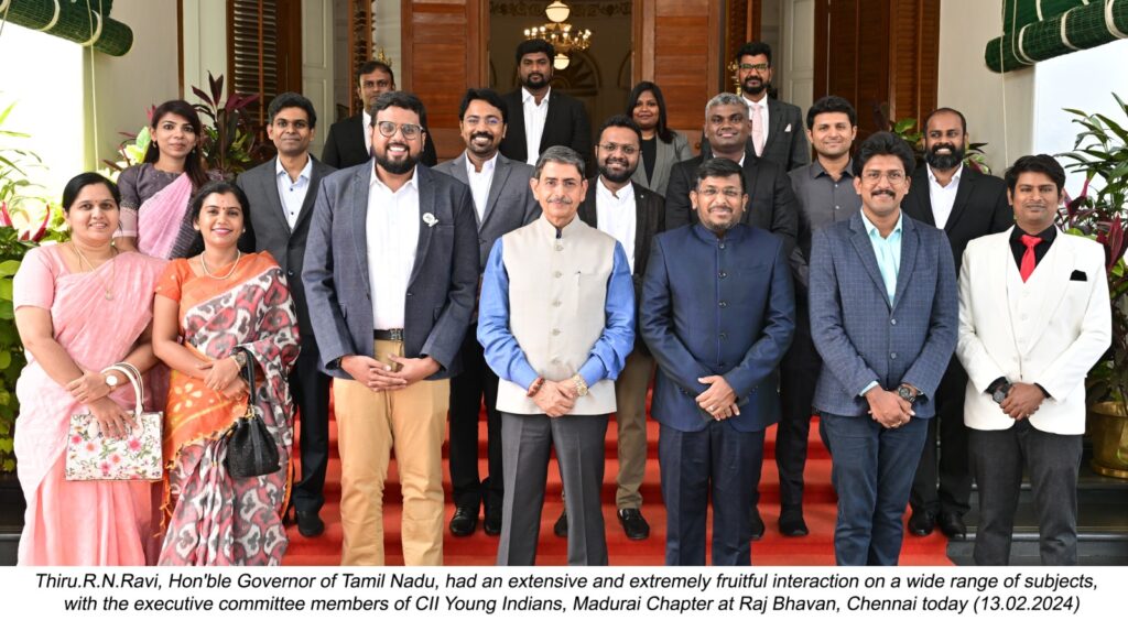 “On February 13th 2024, the Governor had an extensive and extremely fruitful interaction on a wide range of subjects with the executive committee members of CII Young Indians, Madurai Chapter. They exhibit the competitive, innovative and enterprising spirit of youth in India. H exhorted them to channelise the latent positive energy of the society to develop Bharat in the AmritKaal,” a message from Raj Bhavan said today.